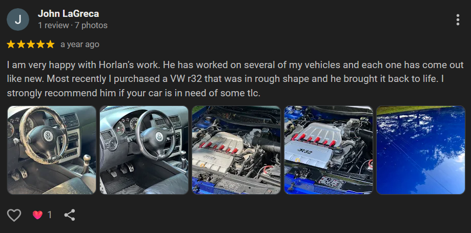 I am very happy with Horlan’s work. He has worked on several of my vehicles and each one has come out like new. Most recently I purchased a VW r32 that was in rough shape and he brought it back to life. I strongly recommend him if your car is in need of some tlc.