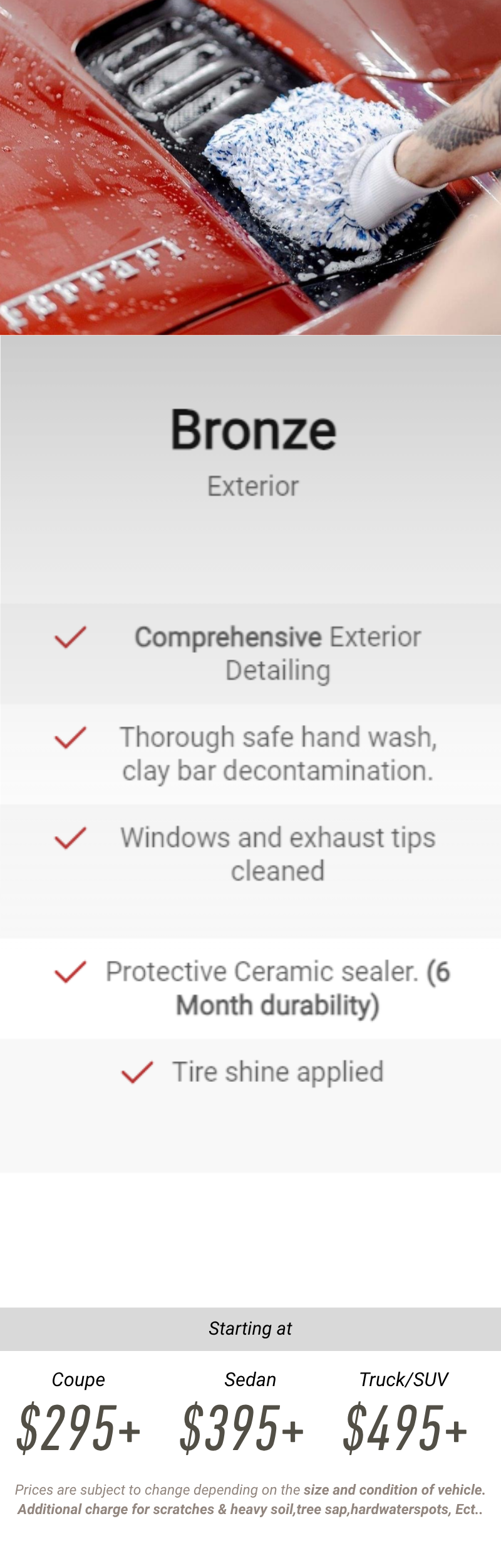 Design to completely cleanses all exterior surfaces including paint decontamination and application of sealant to protect the finish.